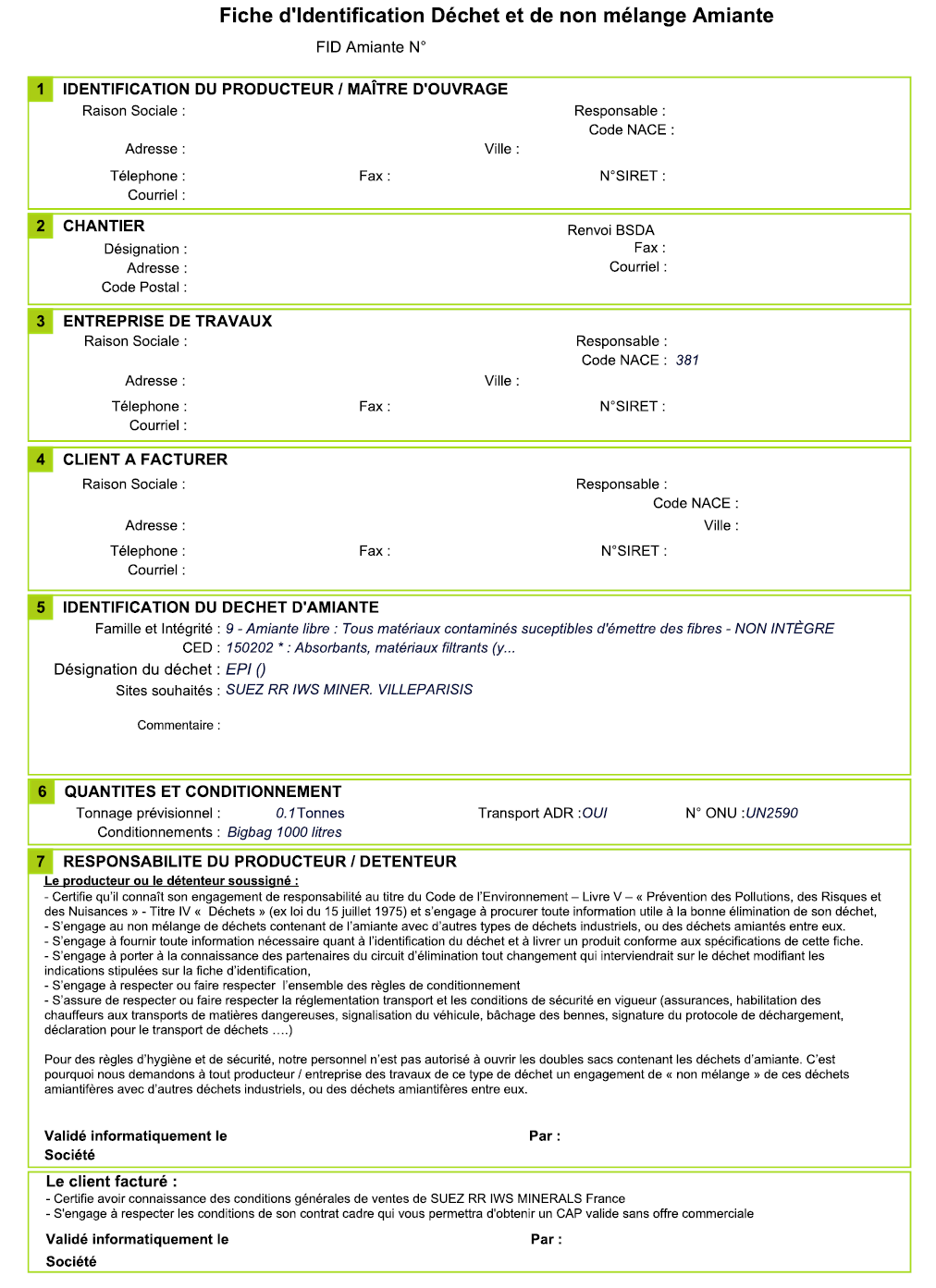 Création de la FID (Fiche Identification Déchets) reprenant le type de produit , sa provenance, le type d'élimination adapté.